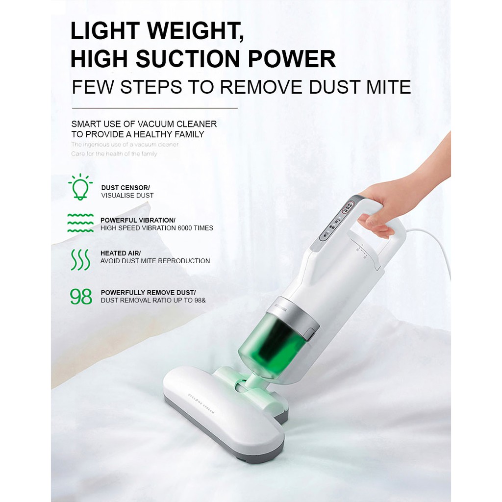 Boasting three levels of deep cleaning an ultra sanitising uv lamp a duel hepa filter a cleaning head that vibrates 8 000 times per minute not to mention a sleek ergonomic design you ll discover a bed bug vacuum cleaner dust remover and crumb buster all in one.